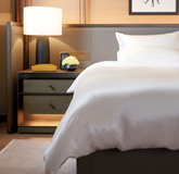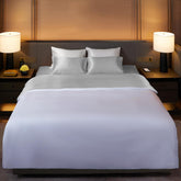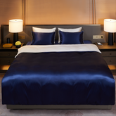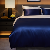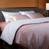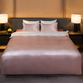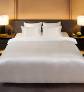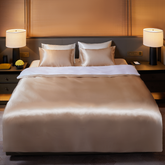 シルクの上品な光沢とコットンのナチュラルな質感が調和し、寝室にエレガントな雰囲気を演出。シンプルでありながらもラグジュアリーなデザインが魅力です。